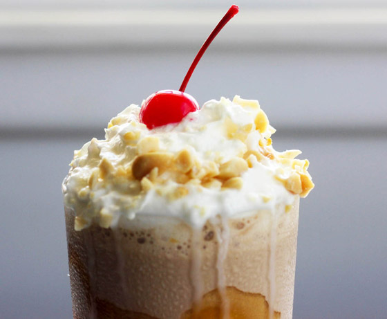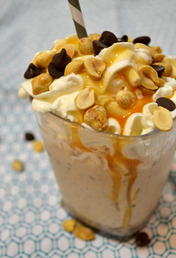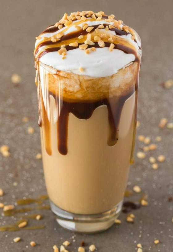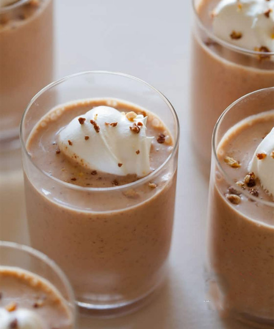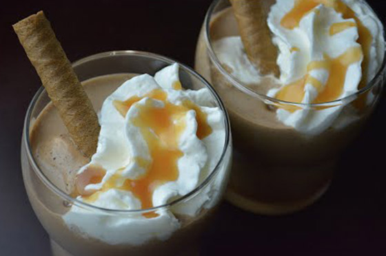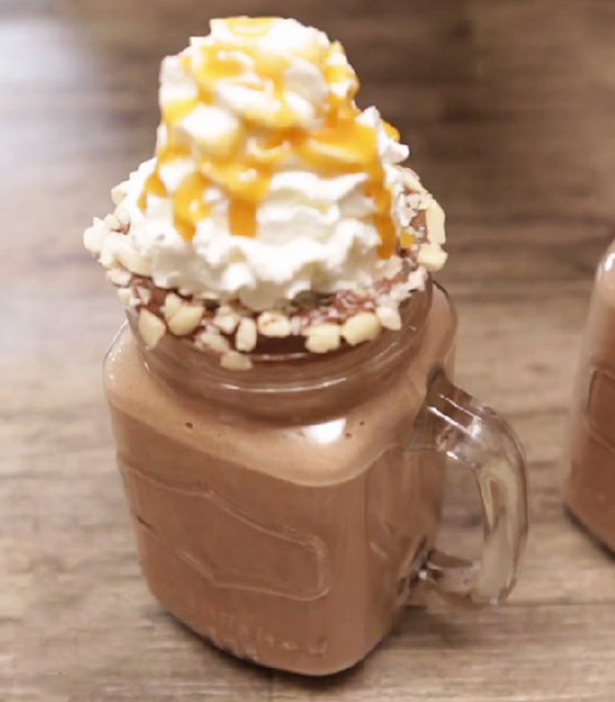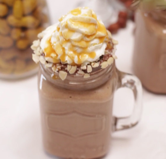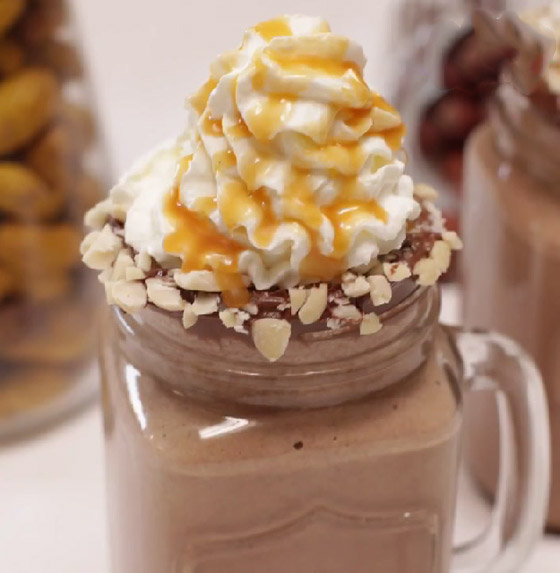 6. صبوا خليط الميلك شيك بالأكواب، وزينوا بالكريمة المخفوقة، والكراميل الجاهز، والمكسرات وقدموه.