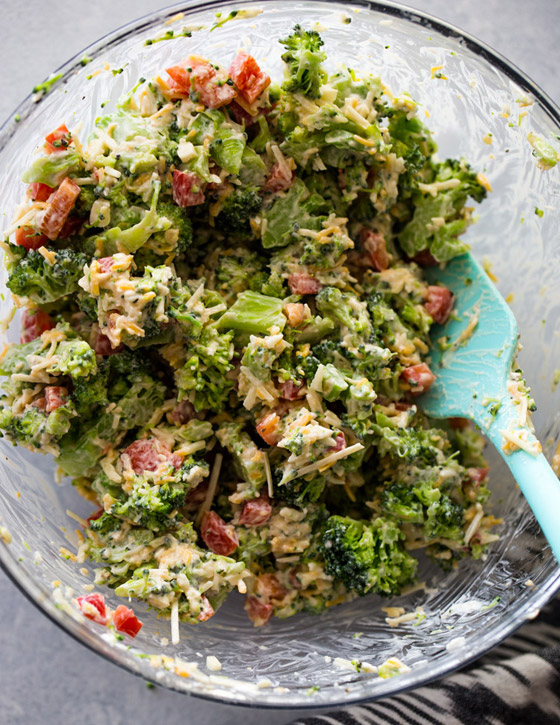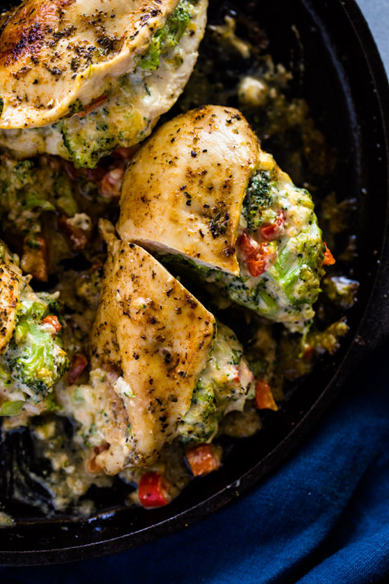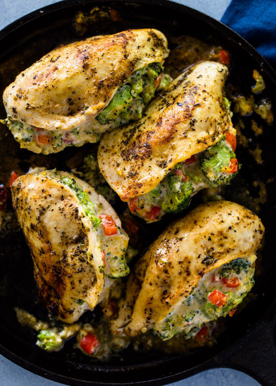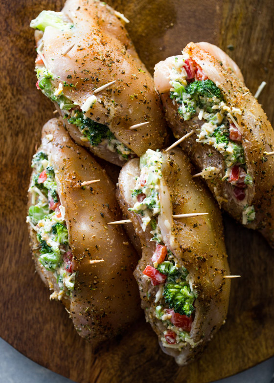 الحشوة، يوضع البروكلي في طبق ميكرويف مع 2 ملعقة كبيرة من الماء. يغطى ويترك لمدة دقيقة واحدة. تخلص من المياه الزائدة. أضف الى الطبق الفليفلة الحلوة والجبن والمايونيز ومسحوق الثوم والملح والفلفل حسب الرغبة. امزج المزيج ، ثم اقسم الخليط بين صدور الدجاج ، واستخدام عيدان خشبية لتثبيتها إذا لزم الأمر.