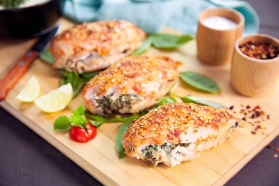 تتبل صدور الدجاج بالملح والفلفل والبابريكا ونصف ملعقة صغيرة من مسحوق الثوم. باستخدام سكين حاد يقطع وسط صدور الدجاج ولكن ليس كاملاً ، مما يوفر جيبًا للحشو.