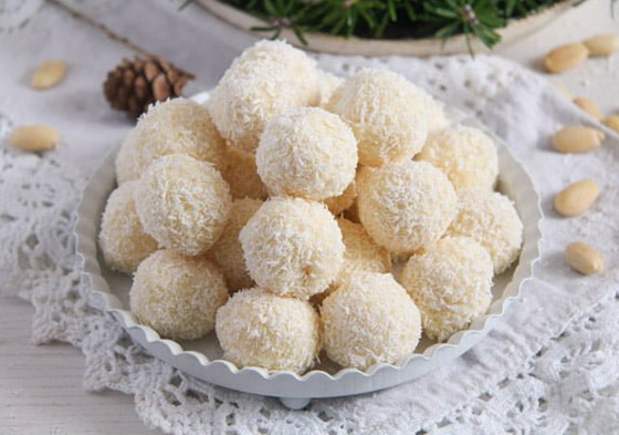 3. في وعاء منفصل ضع القليل من جوز الهند وقم بغمس الكرات التي صنعتها، لتصبح حلوى الرافاييلو جاهزة.