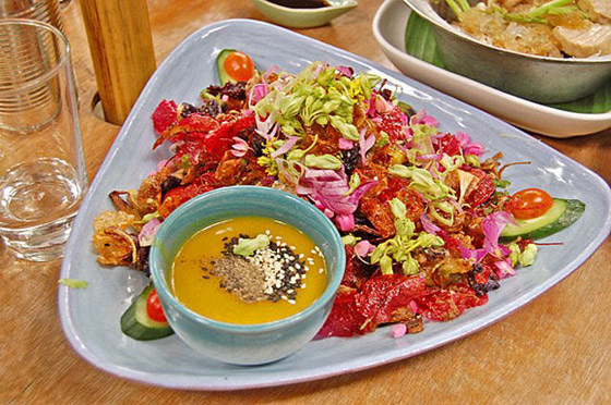 4. الأزهار المقلية - Fried Flowers: صحيح أن معظم من المطاعم وخصوصاً الراقية منها تقدم الورود التي يمكن أكلها مع الأطباق وصحيح أن ربات المنازل أنفسهن بتن يلجأن الى قلي زهرة الكوسا بشكل خاص، لكن الورود التي نتحدث هنا اختصاص تايلاندي فقط. يمكن تناول الزهور المقلية في تايلاند في أي مكان لكونها من الأطباق الشائعة، لكننا ننصح بتجربة السحلبية Orchids. الطبق هذا يمكن تناوله بشكل منفصل أو يمكن تجربة طبق الازهار المتنوعة المقلية مع صلصة خاص به.