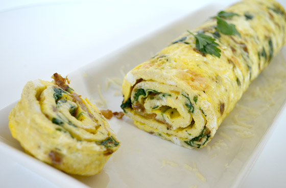 4. تُدخل الصينيّة إلى الفرن الساخن، وتُطهى لنحو عشرين دقيقة، مع مُلاحظة ذوبان أي سائل عن السطح، مع انقضاء الوقت المذكور. توضع الصينيّة جانبًا لدقيقتين، بعد إخراجها من الفرن، ثمّ، يُطوى جانبا الـ"أومليت"، التي تلفّ على هيئة لفافة عبر الإمساك بورق الخبز. تقطّع اللفافة إلى نحو ثماني قطعةً أو عشر منها، بالسكّين. يُقدّم الطبق على الفور.