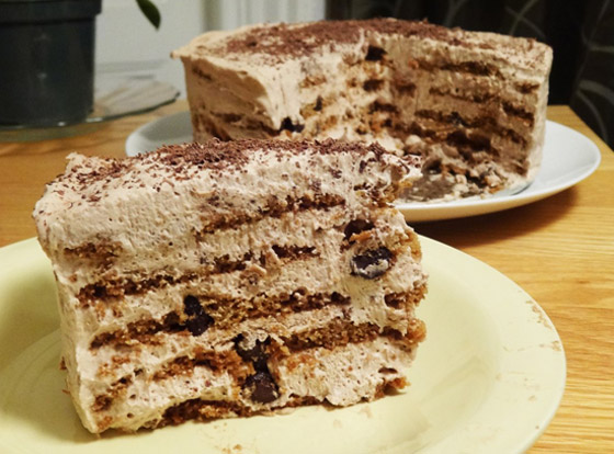 2. الخطوة الثانية: في قالب كيك، قم بدهن الأرضية بالكريمة التي قمت بتحضيرها، ثم قم بترتيب طبقة من كوكيز الشوكولاتة من بسكويت رقائق الشوكولاتة فوقها، بعد ذلك وزع طبقة أخرى من الكريمة فوقها، ثم ضع طبقة ثانية من الكوكيز وغطها بالكريمة.