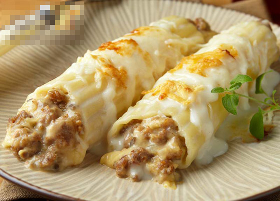 6. صفوا لفائف الكانيلوني في صينية بايركس مدهونة بسمن أو زيت.