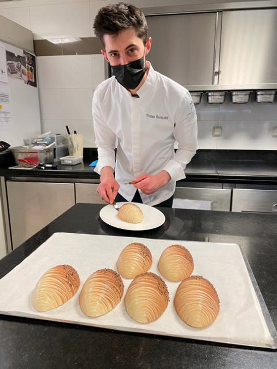 استوحى ترستان شكلَ ولونَ ومكوناتِ بيضِة هذا العام من عالمِ الطفولة وما يحبُ الصغارُ من سكاكرَ كالبندقِ والبسكويتِ الهش إلى جانبِ الشوكولا، فقرر تحضير نصفَ بيضةٍ هذا العام ما يسهلُ قطعها إذ تُقدمُ لثلاثةِ أو أربعةِ أشخاصٍ بعدَ وجبةِ عشاءٍ راقية.