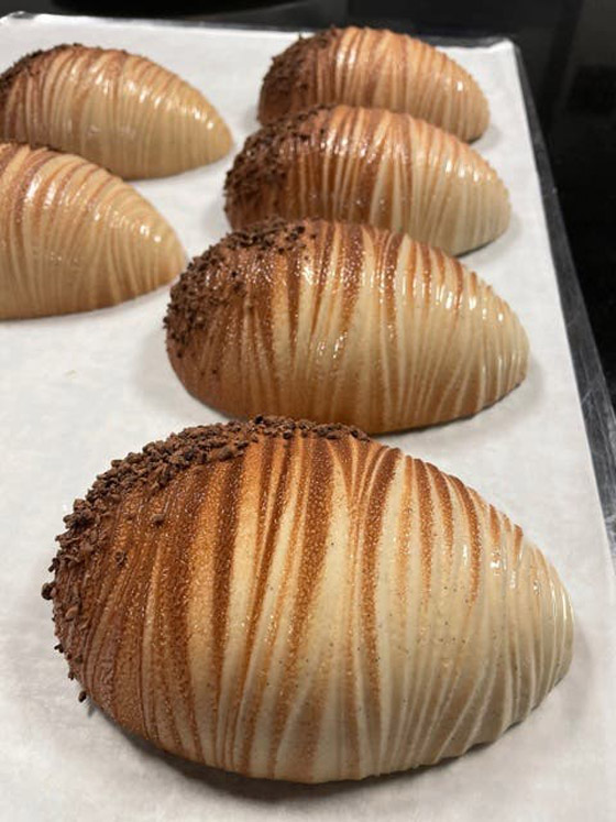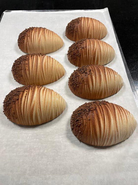 أما الشيف انتوني فاستوحى بيضَ عيدِ الفصحِ هذا العام من قلادةٍ أهداها قبلَ أشهرٍ إلى زوجتِه، ما دفعَه إلى تحقيقِ شكلِها من الشوكولا بتقنيةِ الطباعةِ الثلاثيةِ الأبعاد. بيضةٌ من الشوكولا بالحليب وأخرى من الشوكولا السوداء كلاهما تحويا الأرزَ الهش واللوز َالمحمص.