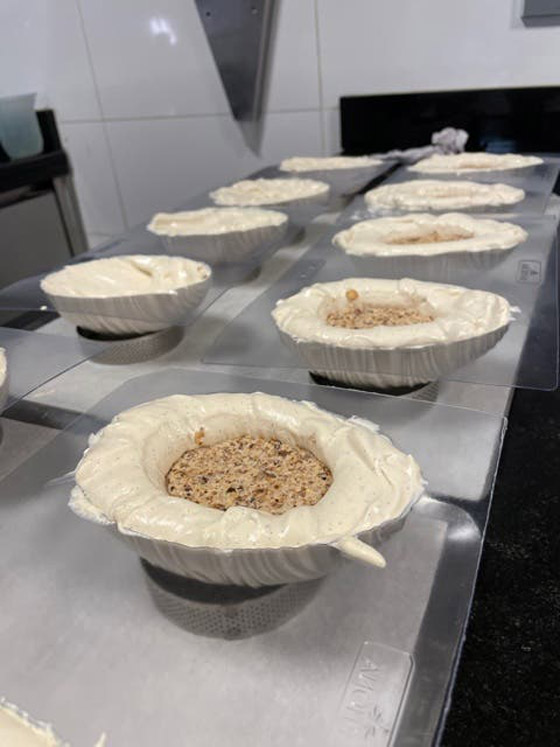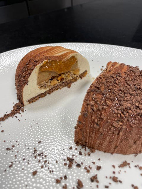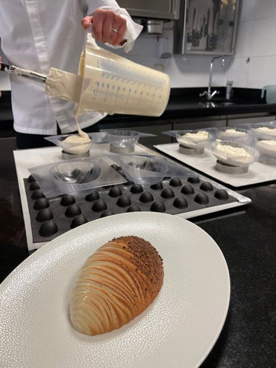 ولعملِ البيضةِ بالشوكولا السوداء مزجُ مكوناتِ القاعدةِ التي تحملُ البيضةِ من الشوكولا المكونةِ من 70% من الكاكاو والأرزِ الهش ولتفريقِها عن بيضةِ شوكولا الحليب وضع القلادةَ بشعارِ المطعمِ الذي يعملُ به.