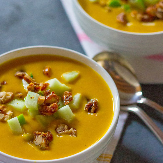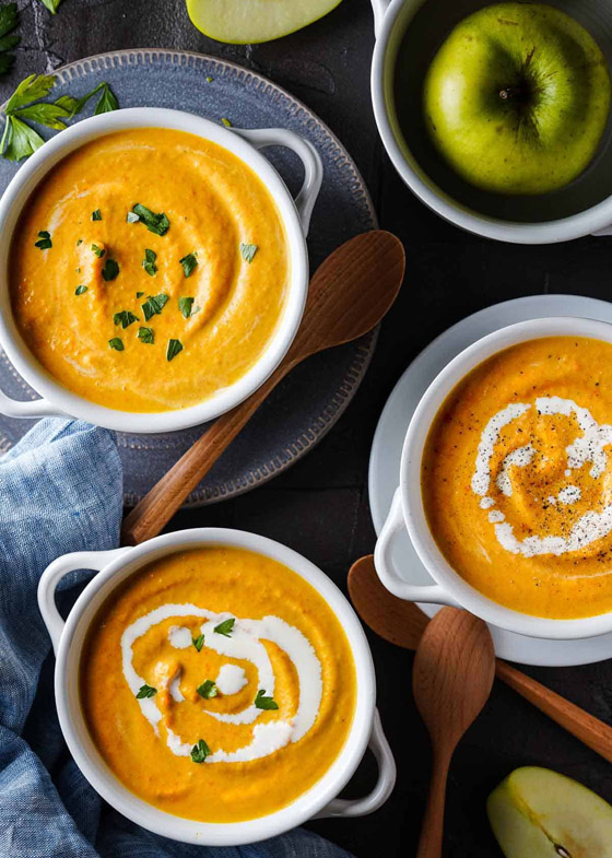 6. اسكبوا الشوربة في طبق التقديم وزينوها بقطع التفاح، ثم قدموها ساخنة.