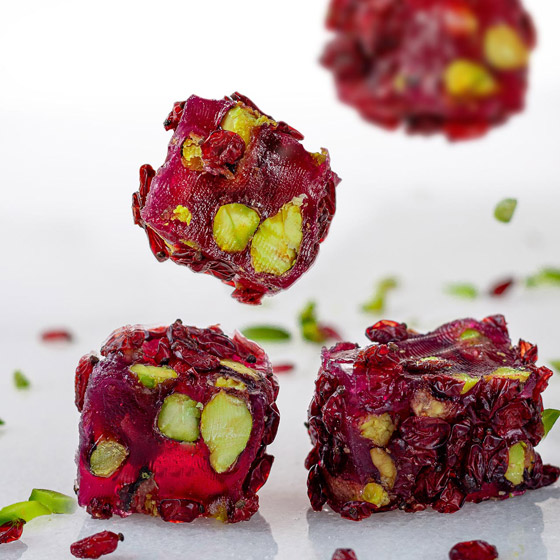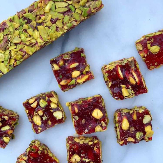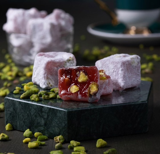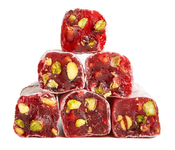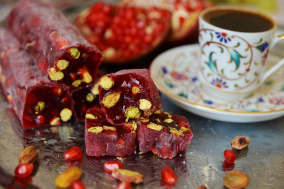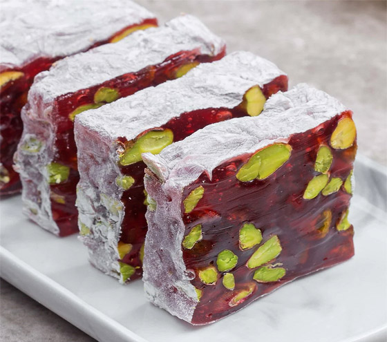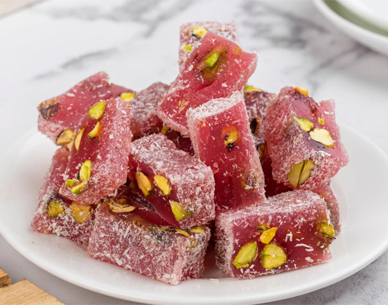 حلقوم تركي بالرمان... يعتبر الحلقوم من الحلويات الشهيرة جداً في المطبخ التركي، ويُحضر بعدة نكهات من ألذها الرمان، نقدم لكم طريقة عمل الحلقوم بطعم الرمان الرائع بالفستق الحلبي، جربوه وقدموه في المناسبات كضيافة رائعة وفاخرة. وقت الطهي: 60 دقيقة.. يكفي ل: 4 أشخاص.