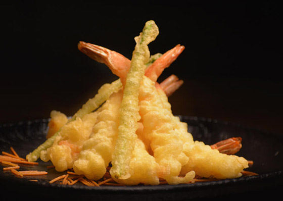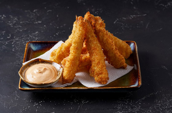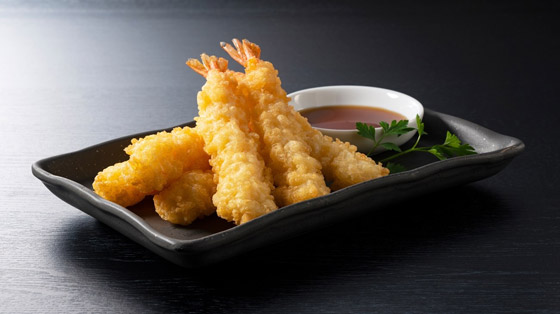تغمس كل حبة من الروبيان داخل كوب من نشاء الذرة ثم في التمبورا، وتقلى بالزيت الساخن مدة دقيقتين أو حتى تصبح ذهبية اللون.