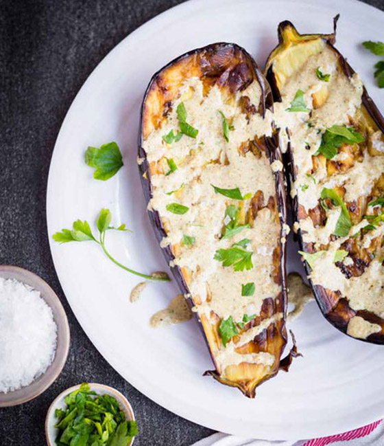 5. اغمروا حبات الكوسا بالكريمة، وانثروا الجبن الرومي على الوجه.