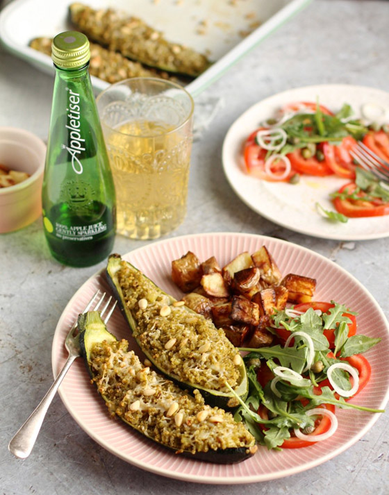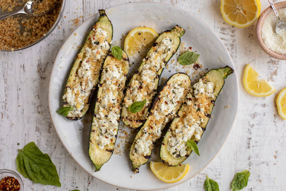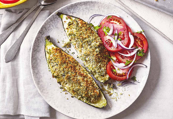 هذه الكوسا المخبوزة محشوة بنكهات فرنسية طازجة، مستوحاة من المكونات اللذيذة لسلطة التونة الكلاسيكية في نيس. تُغطى التونا الغنية باللحم والزيتون اللذيذ المالح بفتات الخبز والبارميزان للحصول على طبقة مقرمشة، ويُزين الطبق بالكامل بسلطة الطماطم والبصل الأحمر. سريعة وسهلة وسوف تستمتع بها الأسرة بأكملها.