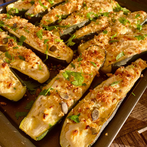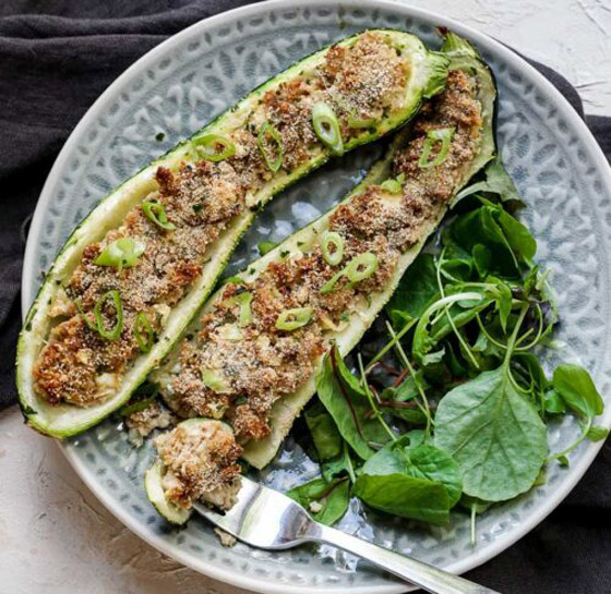 7- ملء الكوسا بخليط التونا ثم تغطيتها بفتات الخبز بالأعشاب.