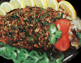 8. يصب على السمكة الخلطة المجهزة وتزين بحلقات الليمون. تقدم ساخنة مع الأرز الأبيض.