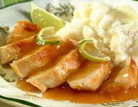 2 - في وعاء التقديم.. نضع صدور الدجاج وتقطع كما هو موضح بالصورة وتسكب عليها الصلصة وتقدّم مع بطاطس مهروسة.
