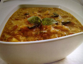 يقشر الطماطم ثم يفرم ناعما، يحمر الثوم في زيت الذره مع مكعب الخضارثم يضاف اليه الطماطم, و الريحان و السكر و الماء و يترك على النار لمدة نص ساعه. يضاف التوست بعد ازالة الحواف الى الشوربه و يترك على نار هادئه حتى يثخن قوام الشوربه، يضاف زيت الزيتون و الخل و تتبل بالملح و الفلفل الاسود وتترك لمدة دقيقتين على النار. تقدم الشوربه ساخنه مع ملعقه صغيره بستو و اوراق الريحان حسب الرغبه