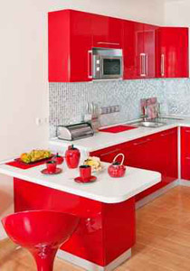 ويمكن استخدام اللون الأحمر بجرأة في المطبخ خصوصا بستايل مودرن وفي مساحة كبيرة كما نرى في هذا المطبخ بدواليب باللون الأحمر مع أسطح رخام باللون الأبيض. ويأتي السقف الساقط بستايل ريفي ليضيف لديكور المطبخ الستيل المودرن لمسة جمال طبيعية، وعلى الرغم من ارتباط الألوان الدافئة في الذهن بالديكور المودرن فإنه يمكن استخدامها مع أي ستايل بما في ذلك الكلاسيكي الحديث، بسفرة وكراسي خشب طبيعي وجدران وستائر هافان.
