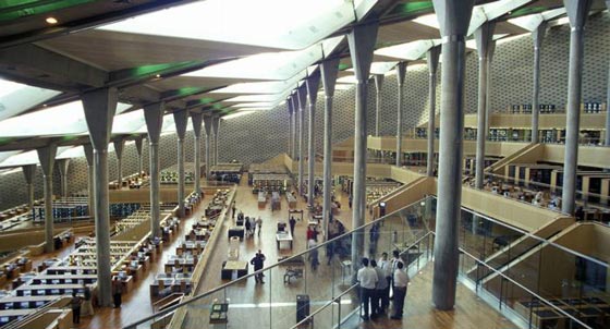 4. مكتبة الإسكندرية - الإسكندرية: العالم القديم يلتقي بالحداثة، كانت مكتبة الإسكندرية تُعتبر المكتبة الأكثر شهرة في العالم قبل أن يدمرها حريق قبل نحو الألفي عام، ويُقال أن حوالي الـ 490 ألف من لفافات نبات البردي تتضمن شتى أنواع العلوم والمعارف قد إحترقت بفعل النيران. وتسير مكتبة الإسكندرية العامة الجديدة على منوال المكتبة القديمة، وقد افتُتِحَت بتاريخ 16 أكتوبر/تشرين أول 2002 وبلغت تكاليف بنائها أكثر من 187 مليون يورو.