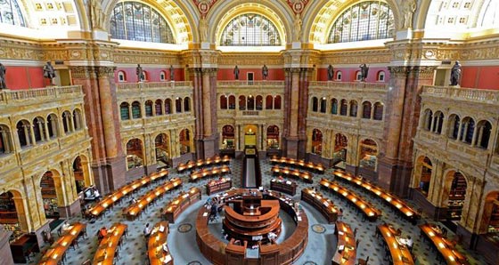 6. مكتبة الكونغرس - واشنطن دي. سي: ننصحك بزيارة مكتبة الكونغرس إذا حط الترحال بك في العاصمة الأمريكية واشنطن دي. سي. تأسست المكتبة في عام 1800 غير أنها تعرضت لحريق بعد 14 عاماً لاحقة على يد البريطانيين. قام الرئيس الثالث للولايات المتحدة الأمريكية ثوماس جيفرسون ببيع قرابة الـ 6،500 ألف كتاب من كُتبه الخاصة لجمع 24 الف دولار لإعادة صيانة وتأهيل المكتبة. بُنيت قاعة المطالعة الرئيسة على طراز عصر النهضة الجديدة.