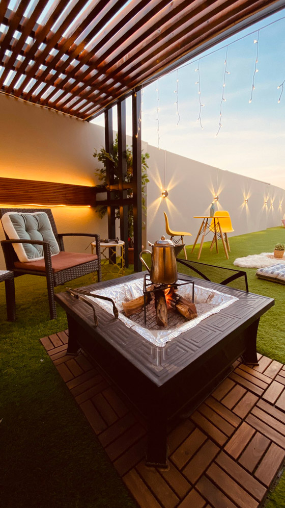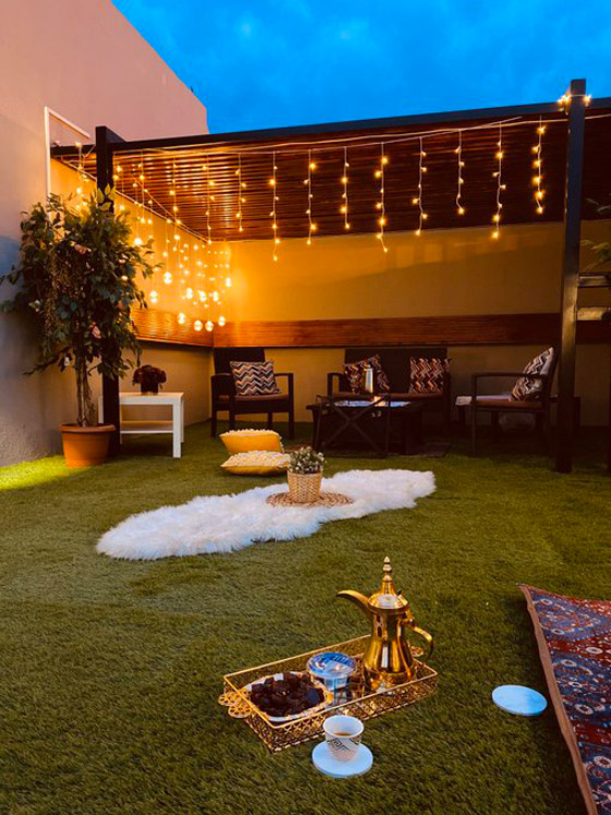 وعن تفاصيل وحدات الغضاءة المستخدمة في التصميم الجديد لسطح منزله قال: “بالنسبه للأضاءه فهي بعد تكلفتها قليله ممكن اللي تعبني شوي هي التمديدات ومحاولة اني ما اخليها تخرب المنظر.. الاضاءه المعلقه بالجلسه كلها كانت عن طريق النت طلب وبأسعار رخيصه جداً ونصيحه اطلب اكثر من قطعه حتى تقدر تغير واذا خرب شي تستبدله بسرعه”.