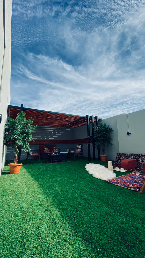 وأوضح متعب العنزي أن مساحة السطح كبيرة لحد ما فاستخدم الثيل الصناعي بخامة عالية الجودة بتكلفة 160 ريال للمتر وتم تثبيتها في الأرضية بشكل جمالي رائع.