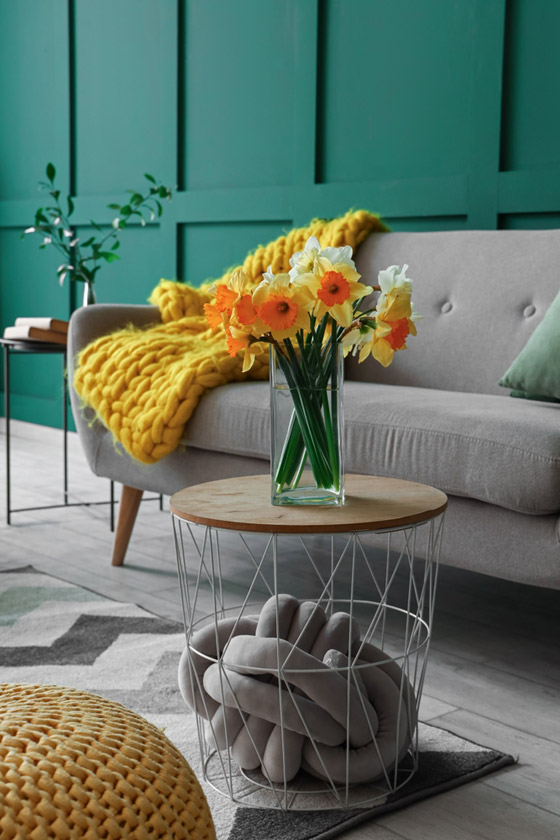 يستحضر الأصفر لون الشمس، وهو لون صيفي بامتياز، يجلب الطاقة والحيوية إلى الفراغ الذي يحلّ فيه، ويمنح القاطنين طاقة إيجابية ويعزز الضوء في الغرفة. ونظرًا لسطوع الأصفر، ينصح باستخدامه بكميات محدودة وذلك من خلال قطع الزينة لا سيما الوسائد، بالإضافة إلى الأزهار واللوحات والستائر... ، وفي حال الرغبة باعتماده في غرف النوم لا بدّ من اختيار الدرجة الفاتحة منه صحبة الأبيض.