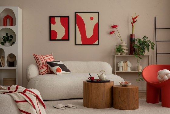الأحمر لون ناري، لذا يفضل اعتماده بنسب محدودة في الفراغ المعماري، من خلال الاكسسوارات والورود والشموع الموزعة على الطاولات والرفوف. الأحمر لون مرغوب في ديكور غرف الطعام، لكونه لون ترحيبي ويفتح الشهية حسب دراسات علم النفس. يفضل الابتعاد عن ادخال الأحمر إلى غرفة النوم لكونه لون ديناميكي، والاكتفاء بحضوره من خلال باقة من الورود.