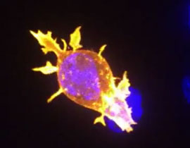 في الفيديو تم تمييز الخلية المناعية باللون الأصفر بينما تظهر الخلايا السرطانية باللون الأزرق.