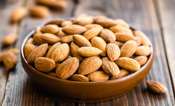 1- اللوز: يعد اللوز من الأطعمة التي تعمل على منع اكتئاب ما بعد الولادة، لاحتوائه على أحماض أوميغا 3 الدهنية، والتي تعمل على تعزيز مستويات هرمون السيروتونين أو هرمون السعادة في الدماغ.