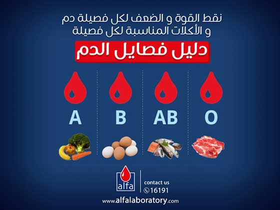 عرض أحد معامل التحاليل الطبية الخاصة، عبر حسابه الرسمي على موقع التواصل الاجتماعي "فيس بوك"، تقريرا عن نقاط القوة والضعف لكل فصيلة دم والأكلات المناسبة لكل منها. ومن المعروف ان هنالك 4 فصائل دم مختلفة تجري في عروق بني البشر.