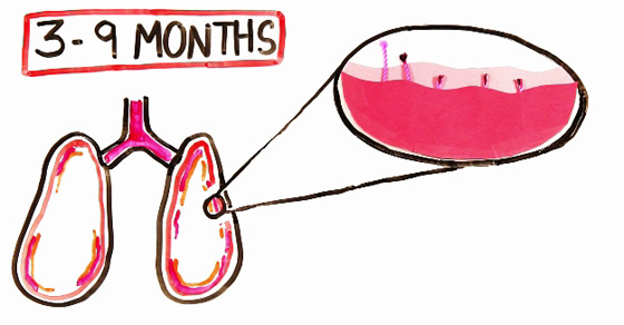 بعد 3 – 9 أشهر: تلتئم الشعيرات في الرئتين، بينما تنحسر تماماً أعراض التوقف عن التدخين مثل السعال وضيق النفس