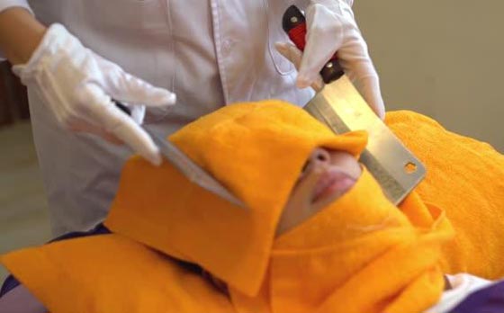 أثار التدليك بالسكاكين ضجة مؤخرا بين السيدات داخل المنتجعات الصحية والسبا. يساعد التدليك بالسكاكين الحادة على استرخاء العملاء، حيث يؤدي المدربون حركات متناغمة بالسكاكين في جميع أنحاء الجسم. وتشتهر التايوانية "هسياو مي فانج" بممارسة هذا النوع من التدليك لأكثر من 13 عاما في تايبيه، وتقول: إنه يعد نوعا من العلاج الصيني ويرجع إلى 2500 سنة.