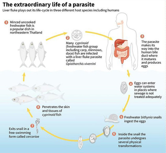 ينصح الأطباء دائما بالابتعاد عن أكل اللحوم النيئة على أنواعها، خوفا من التسمم الخطير. وينطبق الامر أيضا على الاسماك، فقد تبيّن ان اشهر طبق في تايلاند، وهو الـ "كولا بلا" التايلاندي المصنوع من اسماك نيئة طازجة، يكون عادة ملوثا بالطفيليات التي تسبب سرطان الكبد القاتل. والامر ينطبق على الكثير من أنواع السوئي المصنوعة من الأسماك النيئة!!