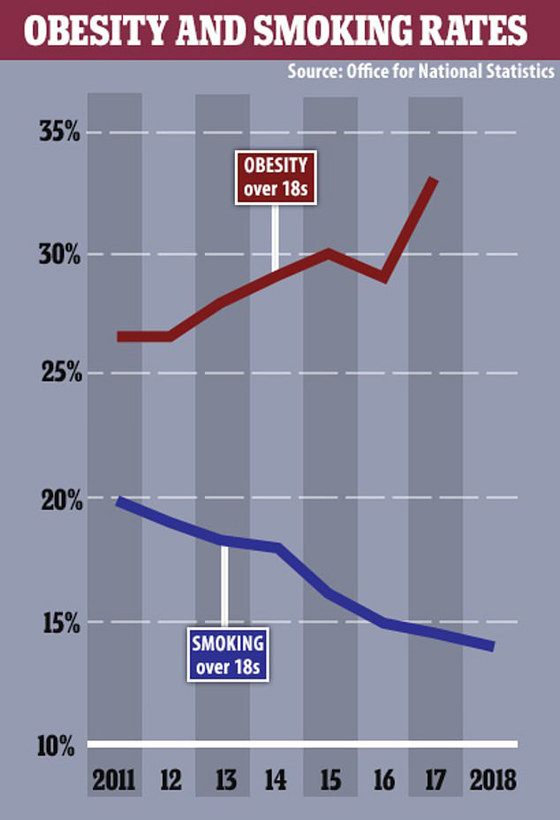 وجاءت تلك النتائج التي أماطت عنها النقاب جمعية بحوث السرطان في المملكة المتحدة لتكشف أيضاً عن وجود حوالي 1900 حالة إضافية من سرطان الأمعاء التي تنتج عن السمنة وليس التدخين في بريطانيا كل عام، كما تبين أن زيادة الوزن تؤدي لحدوث 1400 حالة إصابة إضافية بسرطان الكلى، 460 حالة إصابة إضافية بسرطان المبيض و180 حالة إصابة إضافية بسرطان الكبد مقارنة بما ينتج عن التدخين.