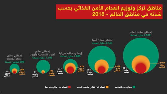 للعام الثالث على التوالي يرتفع عدد الجياع في العالم، وفقا لما كشفه التقرير السنوي الجديد لحالة الأمن الغذائي والتغذية في العالم الذي صدر مؤخرا، ويستعرض إنفوغرافيك مرفق بعض أبرز نتائج التقرير بالإضافة إلى بعض الحقائق والأرقام أساسية حول عدد الجياع في العالم لعام 2018، ومناطق تركز وتوزيع انعدام الأمن الغذائي بحسب شدته في مناطق العالم المختلفة.