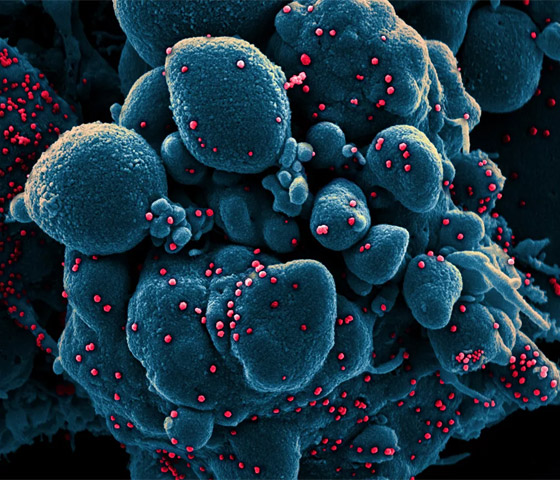 - مسح إلكتروني مصغر لخلية في حالة استماتة (باللون الأزرق) مصابة بجزيئات من الفيروس "SARS-COV-2" (باللون الأحمر)، والمعروفة أيضًا باسم "كورونا"، تم أخذها كعينة من مريض. تم التقاط الصورة في مركز للأبحاث في "فورت ديتريك" بولاية ماريلاند الأمريكية.