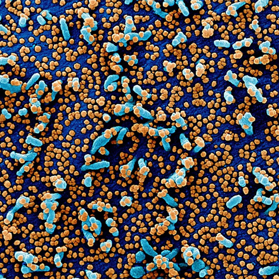- مسح إلكتروني مصغر لخلية فيرو (خلايا توجد في الكلى، باللون الأزرق) مصابة بجزيئات من الفيروس "SARS-COV-2" (باللون البرتقالي)، والمعروفة أيضًا باسم "كورونا"، تم أخذها كعينة من مريض. تم التقاط الصورة في مركز للأبحاث في "فورت ديتريك" بولاية ماريلاند الأمريكية.