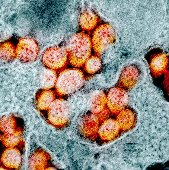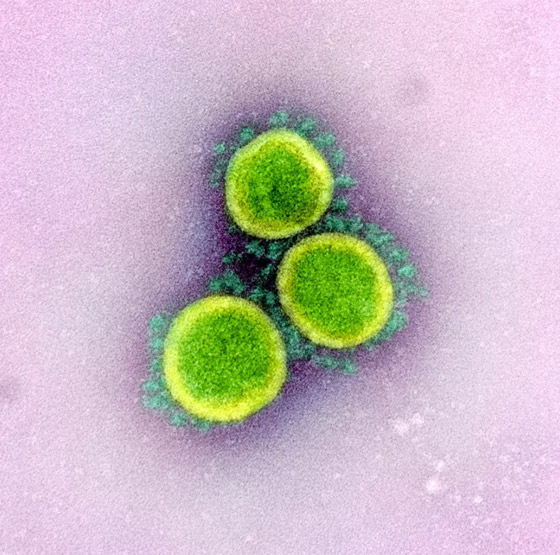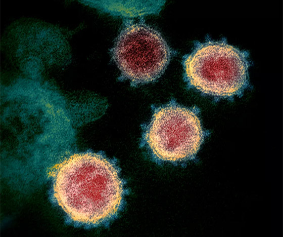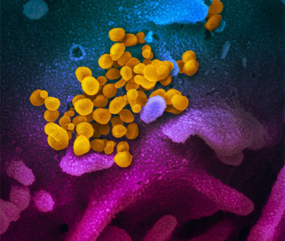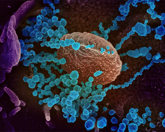 - تُظهر صورة المجهر الإلكتروني لفيروس "SARS-CoV-2"، والمعروف أيضًا باسم الفيروس التاجي الجديد "كورونا"، الذي يسبب مرض فيروسي "COVID-19"، المعزول من مريض في الولايات المتحدة. وتظهر على الخلايا نتوءات صغيرة خارج سطح الخلايا فتبدو كتاج.