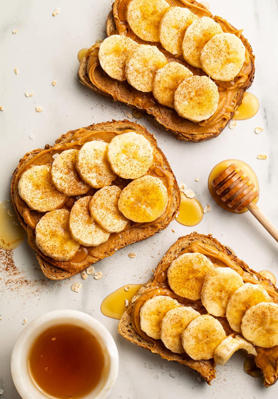 6. الموز وزبدة الفول السوداني: توفر هذه الوجبة الخفيفة التوازن المثالي بين المالح والحلو وهي غنية بالعناصر الغذائية الأساسية.