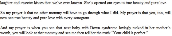 وختمت بقولها: دعائي هو أن ترى الجمال الحقيقي والحب الصافي في كل صورة من صور الموجات فوق الصوتية للأمهات الحوامل. وعندما ترى طفلاً مصاباً بمتلازمة داون متمسك بالحياة في رحم أمه، آمل أن تراني في عيون الأم وأن تخبرها الحقيقة بأن "طفلها كامل وبصحة جيدة".
